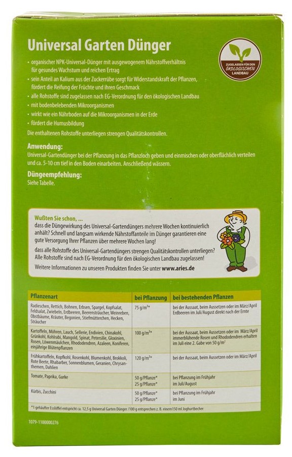 Mod de utilizare: Adaugati fertilizant universal pentru gradina Aries in groapa de plantare si amestecati-l sau intindeti-l la suprafata, si incorporati-l in sol la o adancime de aproximativ 5-10cm. Udati ulterior.