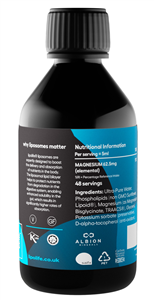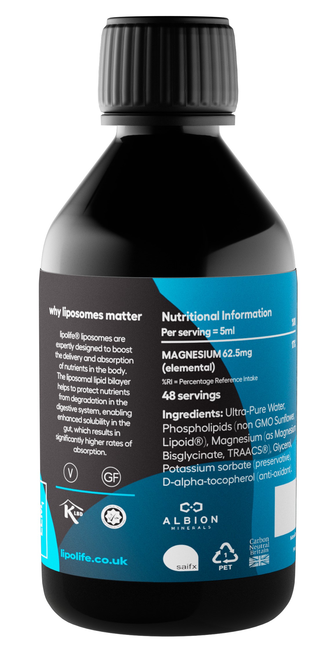 Ingrediente: Apa ultrapura, fosfolipide (floarea soarelui fara OMG, lipoid), magneziu (sub forma de bisglicinat de magneziu, TRAACS®), glicerol, sorbat de potasiu (conservant), D-alfa-tocoferol (antioxidant).