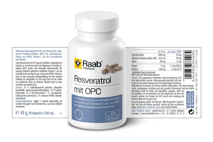 Capsulele Resveratrol cu OPC Raab combina diverse substante vegetale secundare si vitamine. Pe langa polifenolii resveratrol si OPC, capsulele contin vitaminele C (din cirese acerola) si B1 (tiamina), precum si piperina din piper negru. Acestea ofera niveluri standardizate de trans-resveratrol si proantocianidine oligomerice (OPC).