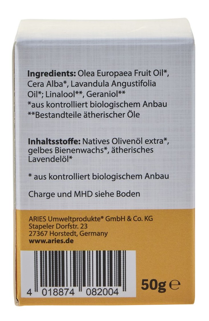 Ingrediente: ulei de masline extravirgin*, ceara de albine galbena*, ulei esential de lavanda*.
