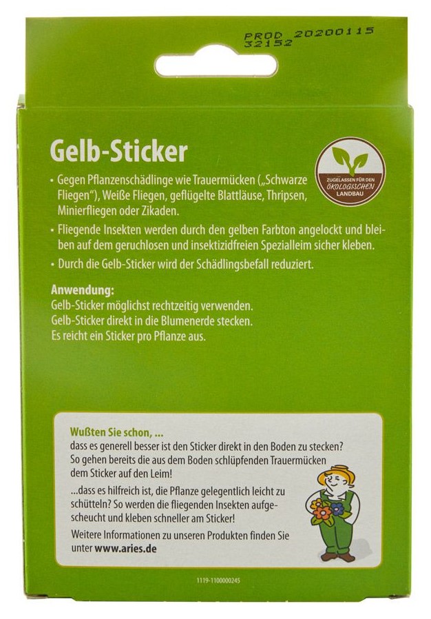 Capcanele autocolante Aries sunt special create pentru reducerea infestarilor cu daunatori. Sunt eficiente impotriva daunatorilor plantelor, cum ar fi musculitele negre, musculitele albe, afidele inaripate, tripsii, mustele miniere si cicadele. Acestea sunt atrase de culoarea galbena si raman lipite in siguranta de adezivul special inodor si fara insecticide.