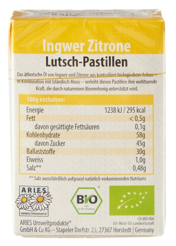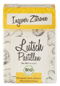 Ingrediente: agent gelificant: guma arabica*, zahar*, sirop de glucoza*, miere* 7.5%, extract de muschi islandez* 1.4%, concentrat de suc de lamaie* 0.8%, ulei de lamaie* 0.5%, ulei de ghimbir* 0.3%, extract de vanilie*, agent de demulare: ceara de carnauba*.